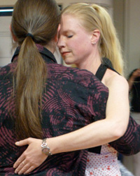 John-Michael und Sabine unterrichten sowohl die enge als auch die offene Umarmung und versuchen durch machbares Schrittmaterial ein Gefühl für das musikalische Tanzen zu vermitteln.