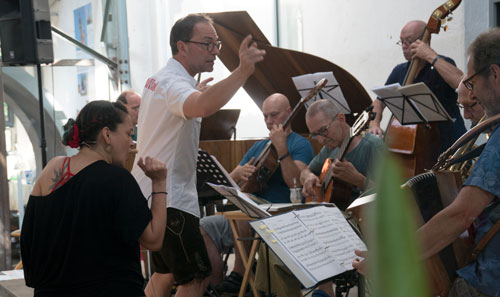 In our rehearsals we use the pieces to develop the important themes of (tango) music: interplay, phrasing, rhythm, improvisation, handling of the microphone and stage fright. The repertoire growing during the week will performed for the dancers last Saturday.